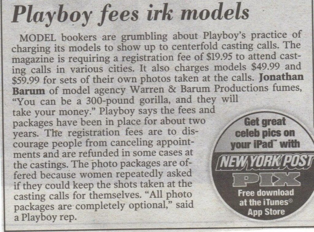 Related news with Playboy and Jonathan Baram on “Page 6” in the New York Post news paper protecting his model clients.