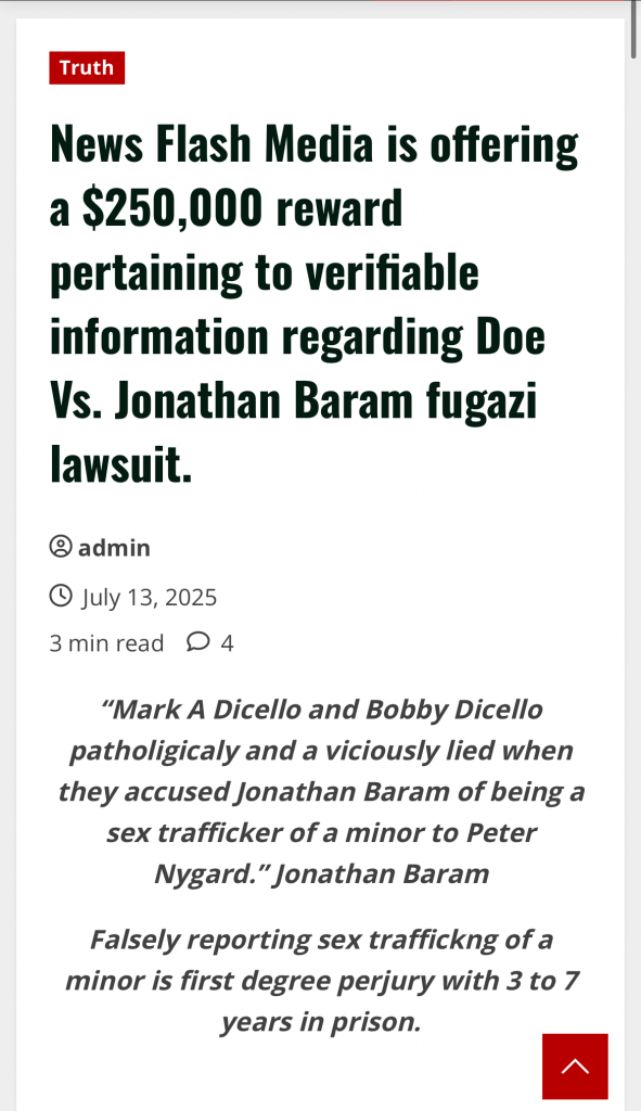 2 thoughts on “News Flash Alert: “Sin City” Las Vegas, lawfirm Dicello, Levitt and Gutzler broke the “9th commandment.” Deceptive fantasists Dicello claimed Jonathan Baram assaulted (Penal Law 130.52) and sex trafficked a minor to Peter Nygard. Falsely reporting sex trafficking is First Degree Perjury (Class D) and 3 to 7 years in prison.